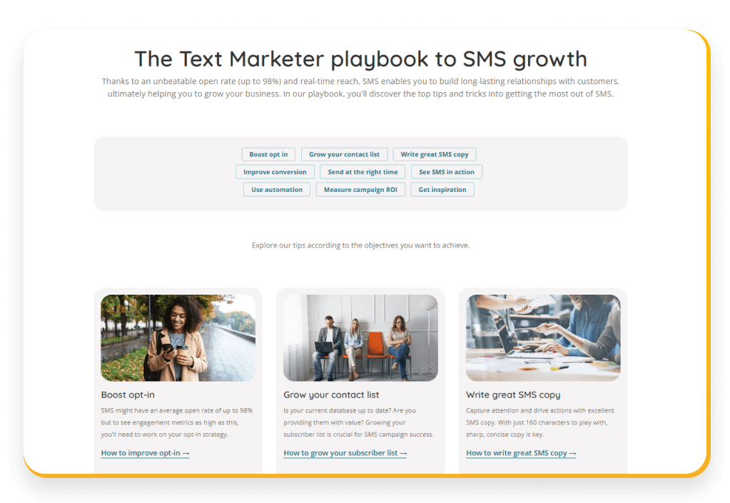 With a 98% open rate and real-time reach, it’s the ideal channel to connect with customers and build long-lasting relationships with them. From tips on how to start SMS marketing or the best time to send texts, discover best practices in our playbook.